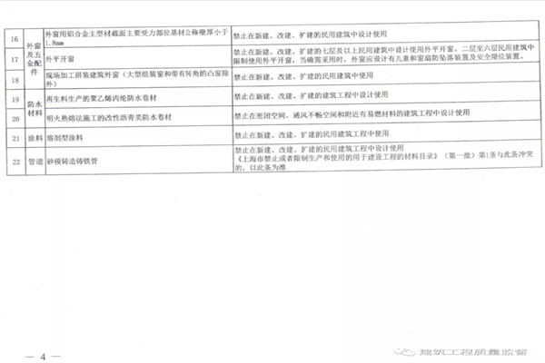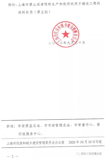 2020年9月30日,上海市住房和城市建設管理委員會關于公布《上海市禁止或者限制生產和使用的用于建設工程的材料目錄《(第五批)》的通知